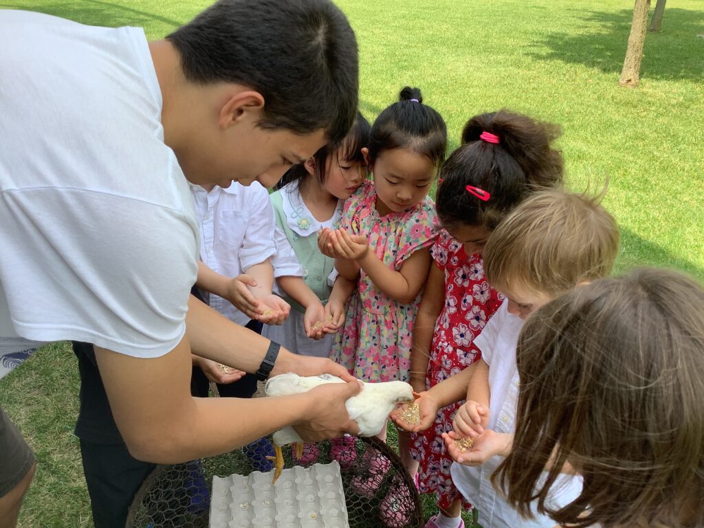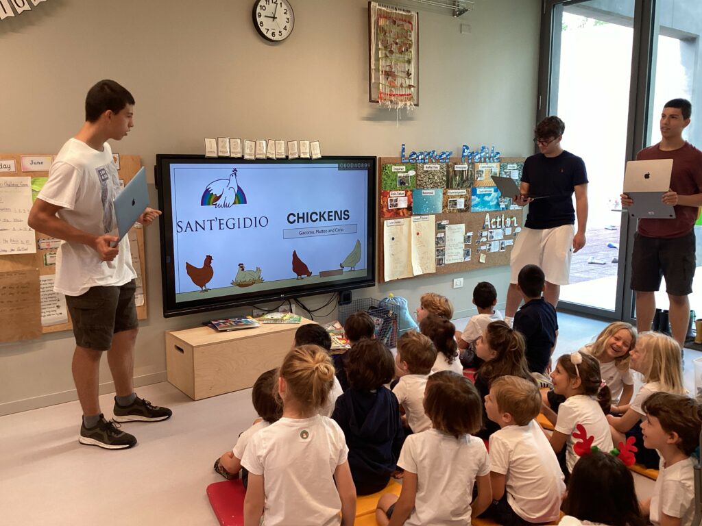Last week, three of our DP students, Giacomo and Matteo Parra Osorio and Carlo Sadocco shared their CAS project about Life Cycles with our three Early Years classes. Our students learned about the life cycle of chickens and then got to meet several different chickens of different ages.